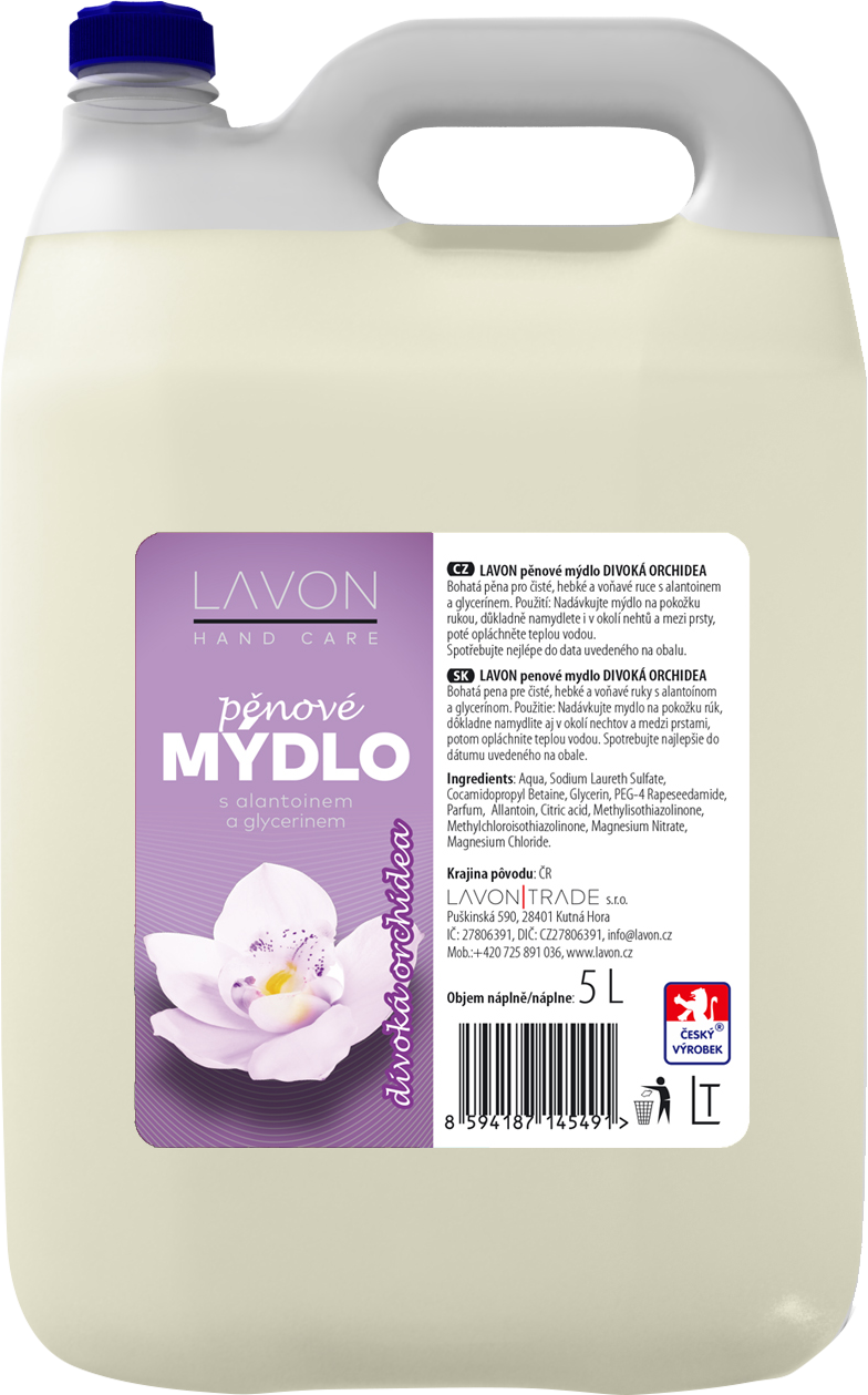 LAVONEA pěnové mýdlo 5 l je prémiová kvalita mýdla s neutrálním pH pro hebké, čisté a voňavé ruce. Obsah glycerinu a alantoinu napomáhá regeneraci Vaší pokožky. Extra pěnivé mýdlo zajistí Vašim rukám a pokožce dokonalé mytí a dokonalou hygienu. Mytí rukou patří k základním hygienickým návykům. Pěnové mýdlo Lavon je vhodné pro každodenní péči o pokožku rukou a těla. Mýdlo bohatě pění a spolehlivě odstraní z rukou a pokožky špínu a nečistoty. Lavon pěnové mýdlo nedráždí Vaši pokožku a zanechá ji jemnou, hebkou a dostatečně hydratovanou.