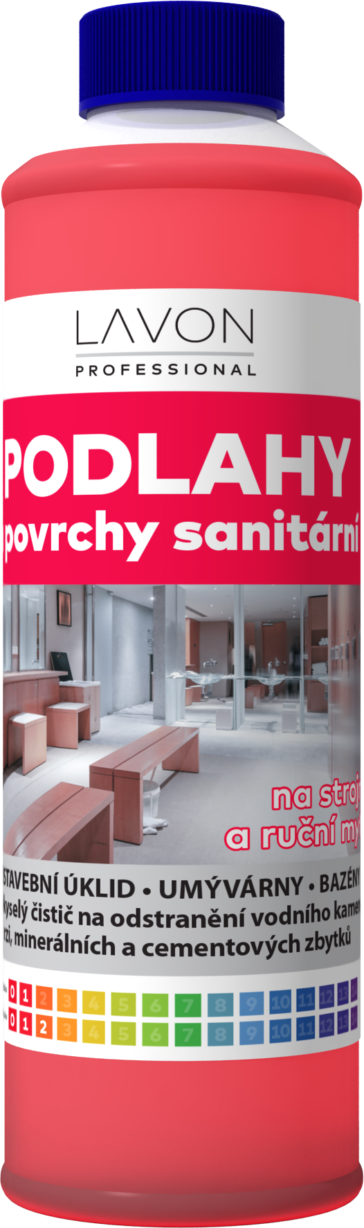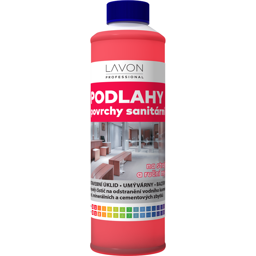 Lavon podlahy a povrchy sanitární 1 l je silně kyselý, nízkopěnivý čistič na odstranění vodního kamene, rzi, minerálních a cementových zbytků. Vhodný na dlažby, keramické obklady, umyvadla, vodovodní baterie, vany, pisoáry, WC mísy, bazény.
