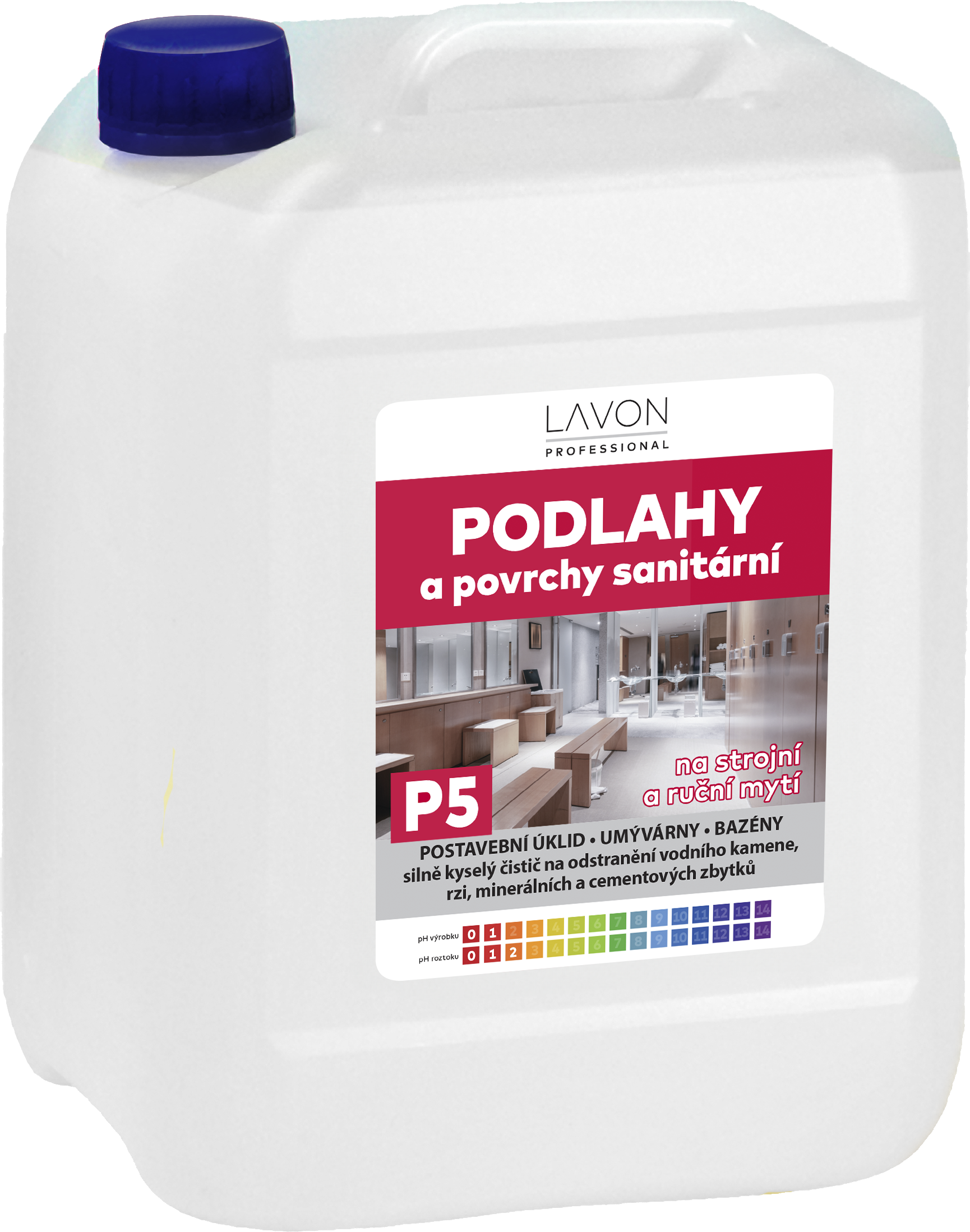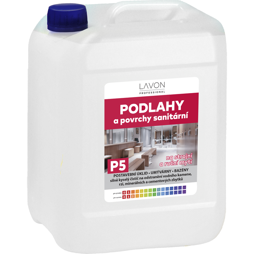 Lavon podlahy a povrchy sanitární 5 l je silně kyselý, nízkopěnivý čistič na odstranění vodního kamene, rzi, minerálních a cementových zbytků. Vhodný na dlažby, keramické obklady, umyvadla, vodovodní baterie, vany, pisoáry, WC mísy, bazény.
