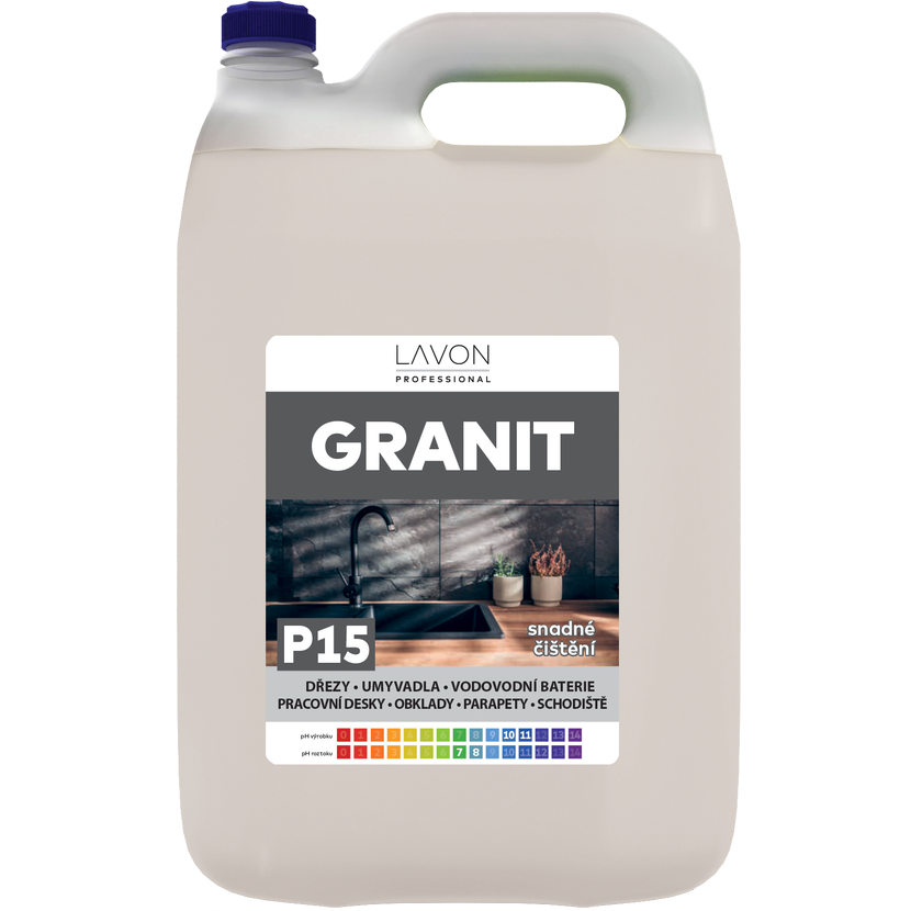 Lavon Granit je speciální čistič určený na všechny druhy granitových povrchů (granitové kompozity). Snadno odstraňuje nečistoty bez poškození povrchu. Vhodné na dřezy, prkénka, kuchyňské a jiné pracovní desky, obklady, umyvadla, vodovodní baterie, dlažby, schodiště, parapety.