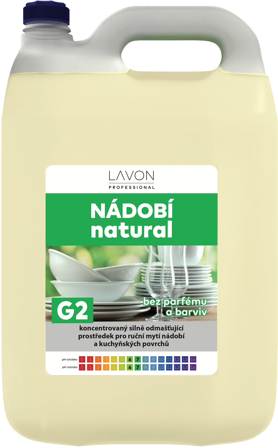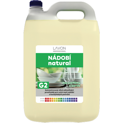 Lavon nádobí natural 5 l je koncentrovaný, vysoce pěnivý prostředek pro ruční mytí nádobí a kuchyňských povrchů bez parfemace a barviv. Účinně a rychle odstraňuje mastnotu a další nečistoty. Zajistí čistotu a lesk všech druhů nádobí a kuchyňských povrchů.