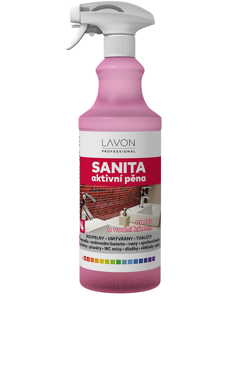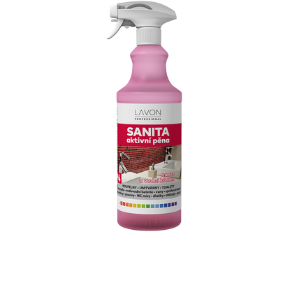 Lavon sanita aktivní pěna 1 l je vysoce účinný prostředek s obsahem kyseliny methansulfonové a mléčné, které jsou 100% biologicky odbouratelné a šetrné k povrchům. Na odstranění vodního kamene, zbytků mýdla, rzi, minerálních a močových usazenin, vápenných nánosů, případně cementových zbytků. Při pravidelném použití oživuje povrchy a zabraňuje jejich opětovnému znečištění. Hustá pěna spolehlivě ulpívá na hůře dostupných místech a prodlužuje čas působení. Pro čistotu, lesk a ochranu povrchů nejen v koupelnách. Přípravek lze použít na umyvadla, vodovodní baterie, vany, sprchové kouty, zástěny, pisoáry, WC mísy, dlažby, keramické obklady, spáry; je vhodný i na postavební úklid.