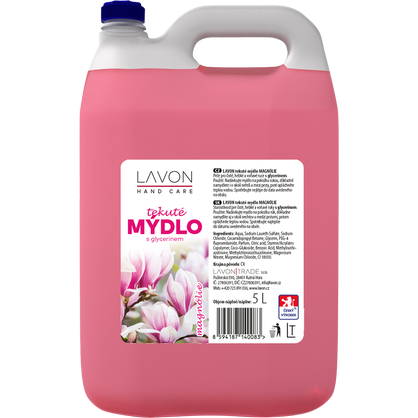 LAVONEA tekuté mýdlo magnólie 5 l je kvalitní mýdlo s neutrálním pH a glycerinem pro hebké, čisté a voňavé ruce. Tekuté mýdlo zajistí Vašim rukám a pokožce dokonalé mytí a dokonalou hygienu. Mytí rukou patří k základním hygienickým návykům. Tekuté mýdlo Lavon je vhodné pro každodenní použití. Mýdlo bohatě pění a spolehlivě odstraní z rukou a pokožky špínu a nečistoty. Lavon tekuté mýdlo nedráždí Vaši pokožku a zanechá ji jemnou a hebkou.