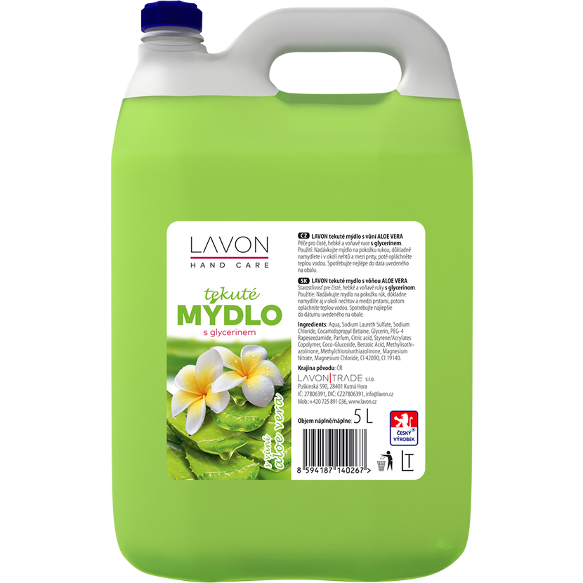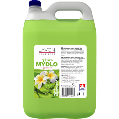 LAVONEA tekuté mýdlo s vůní aloe vera 5 l je kvalitní mýdlo s neutrálním pH a glycerinem pro hebké, čisté a voňavé ruce. Tekuté mýdlo zajistí Vašim rukám a pokožce dokonalé mytí a dokonalou hygienu. Mytí rukou patří k základním hygienickým návykům. Tekuté mýdlo Lavon je vhodné pro každodenní použití. Mýdlo bohatě pění a spolehlivě odstraní z rukou a pokožky špínu a nečistoty. Lavon tekuté mýdlo nedráždí Vaši pokožku a zanechá ji jemnou a hebkou.