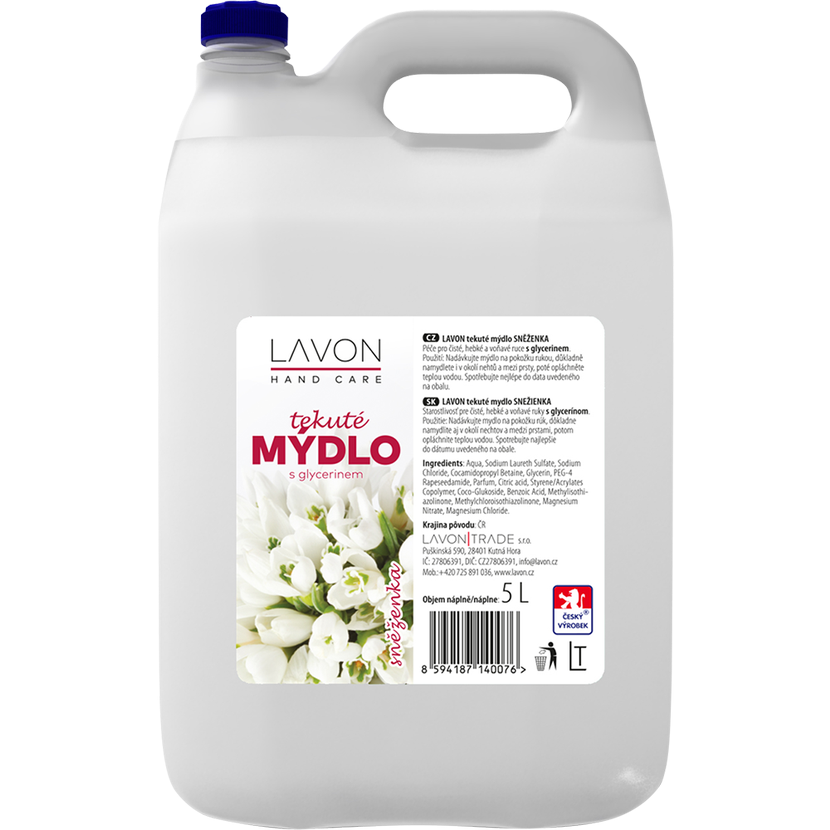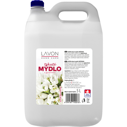 LAVONEA tekuté mýdlo sněženka 5 l je kvalitní mýdlo s neutrálním pH a glycerinem pro hebké, čisté a voňavé ruce. Tekuté mýdlo zajistí Vašim rukám a pokožce dokonalé mytí a dokonalou hygienu. Mytí rukou patří k základním hygienickým návykům. Tekuté mýdlo Lavon je vhodné pro každodenní použití. Mýdlo bohatě pění a spolehlivě odstraní z rukou a pokožky špínu a nečistoty. Lavon tekuté mýdlo nedráždí Vaši pokožku a zanechá ji jemnou a hebkou.