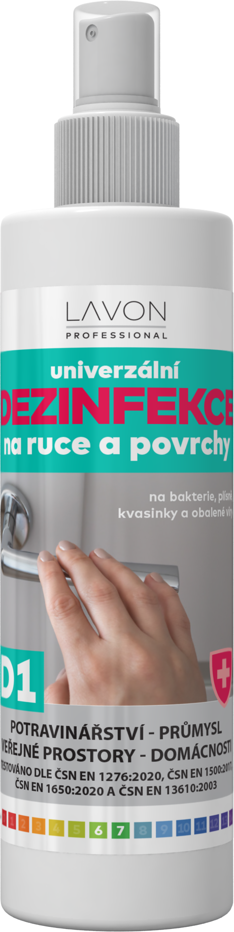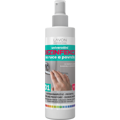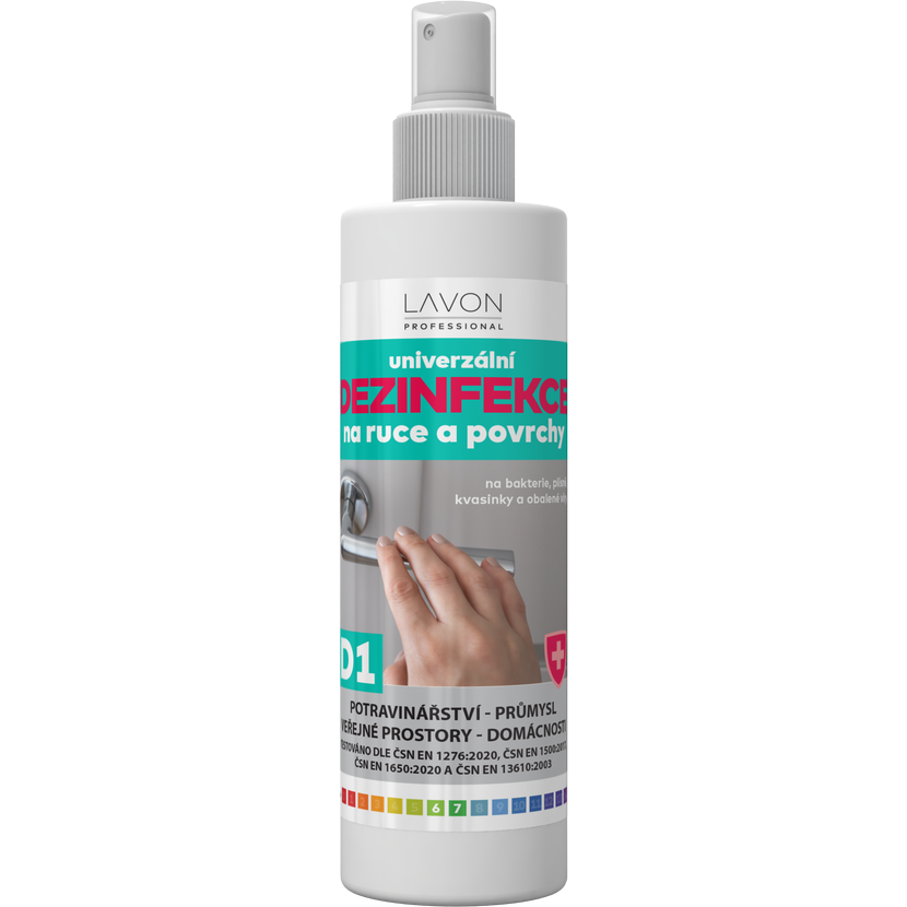 LAVON univerzální dezinfekce na ruce a povrchy je biocidní přípravek pro spotřebitelské a profesionální použití v potravinářství, průmyslu, domácnostech a veřejných prostorách. Určen k dezinfekci rukou, pracovních ploch či povrchů zařízení. V rámci prevence používat na místa, která přicházejí do častého kontaktu s rukama (kliky, zábradlí, vodovodní baterie apod.). Otestováno dle ČSN EN 1276:2020, ČSN EN 1500:2017, ČSN EN 1650:2020 a ČSN EN 13610:2003. LIKVIDUJE BAKTERIE, KVASINKY, PLÍSNĚ A OBALENÉ VIRY. Obsahuje 65 % alkoholu.