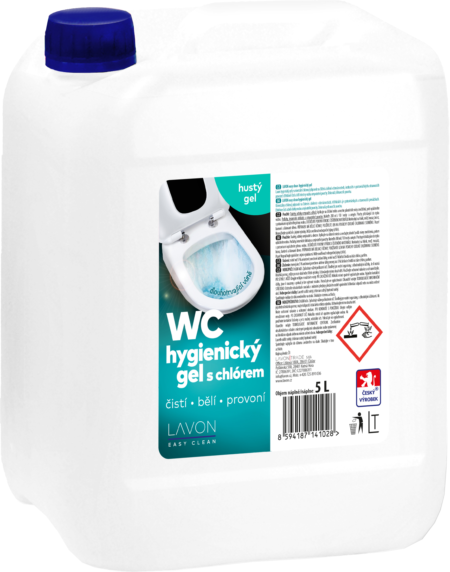LAVON hygienický gel s chlórem 5 l je univerzální chlórový přípravek na čištění a bělení v domácnostech, institucích i v potravinářských a stravovacích provozech. Efektivně čistí a bělí všechny vodou omyvatelné povrchy. Vhodné na toalety, odtoky umyvadel a dřezů, podlahy, keramické obklady a všechny omyvatelné povrchy odolné prostředkům s chlornanem sodným. Dokonalá přilnavost k povrchu.